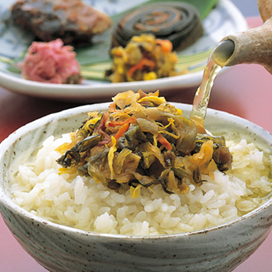 三奥屋の代表的な漬物。春の山菜から夏野菜、そして晩秋を飾る菊花まで、その時その時の旬をしまい込み、1年から2年寝かせた逸品です。1年がかりで塩漬けし、さらに梅酢を用い本漬けで仕上げられています。
